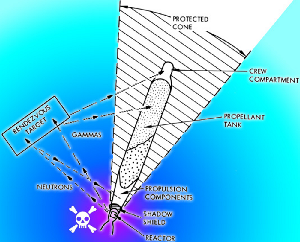 The fraction of radiation that cannot be avoided is handled using radiation shielding, with different layers meant to absorb different types of radiation. It is placed as close as possible to the reactors or engines to create the widest shadow of protection, which is why they are also called shadow shields.