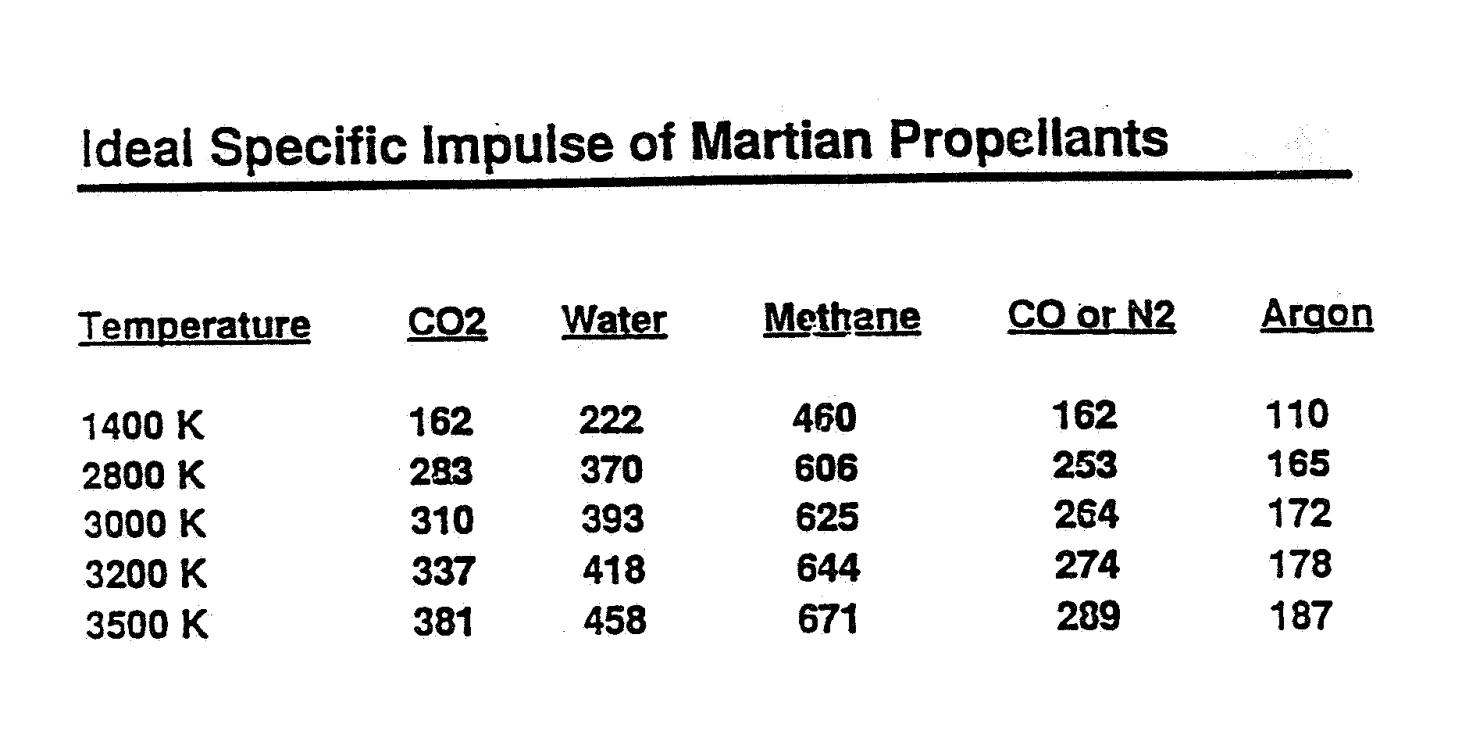 Most significant for our purposes is methane as propellant. It is six times denser than liquid hydrogen, can be stored at 100K, which is compatible with liquid oxygen, and it can be produced using water and carbon dioxide. At high temperatures, it breaks down into hydrogen and carbon, turning it from a 16 g/mol molecule into a 3.25 g/mol plasma. That is how it achieves a specific impulse only mildly lower than what is achievable using liquid hydrogen. Zubrin lists its specific impulse as 606s when heated to 2800K, or 625s at 3000K.