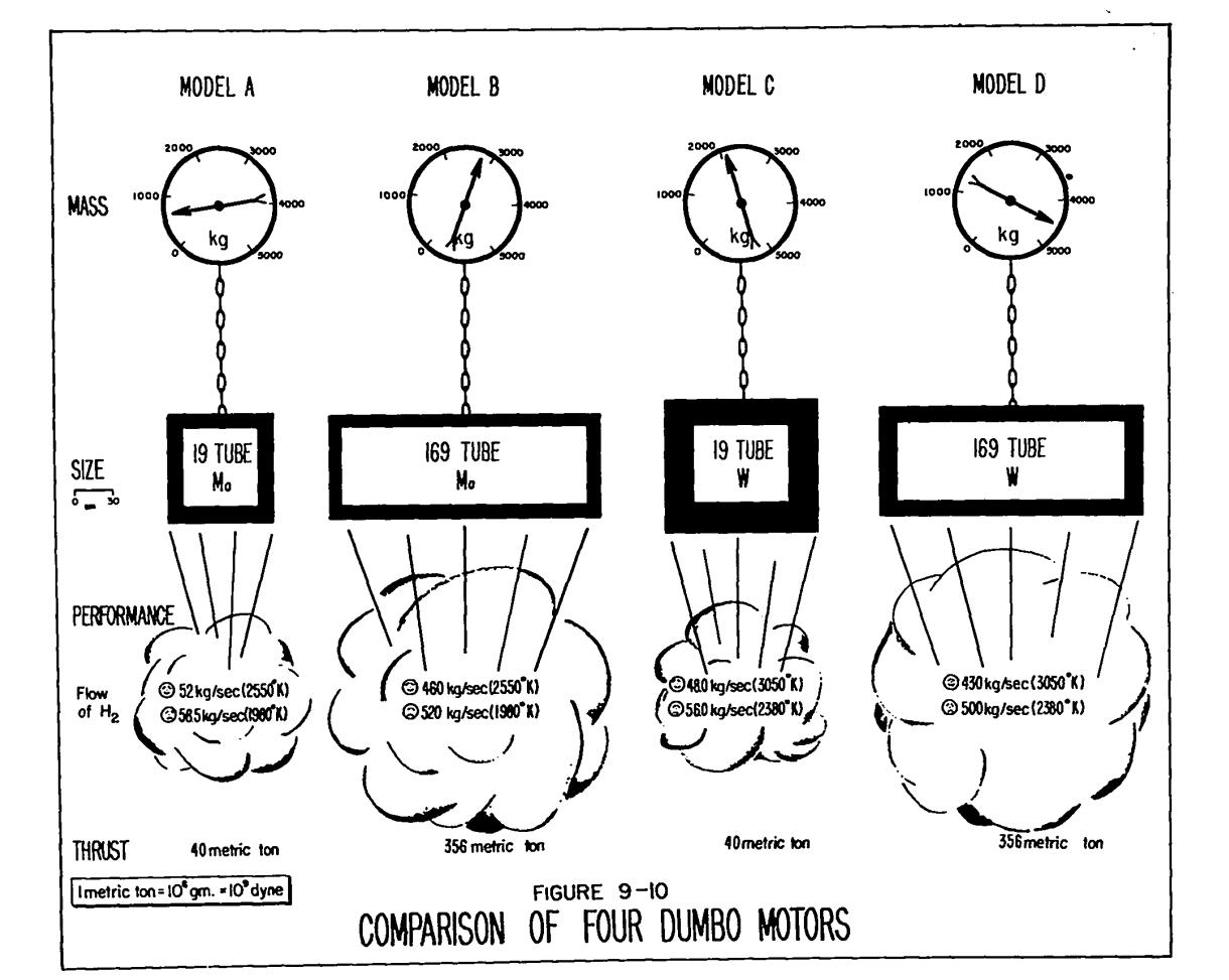 Project Rover, for example, resulted in the Phoebus-2A reactor that managed an output of 4000 MW for 12 minutes during a test run. As a fully developed engine, it would have managed 5000 MW and 825s of specific impulse. It would have held 300 kg of enriched uranium and had a relatively cool core temperature of 2300 K (although the goal was 2500 K). Total mass was 9300 kg, meaning it had an impressive power density of 537 kW/kg.